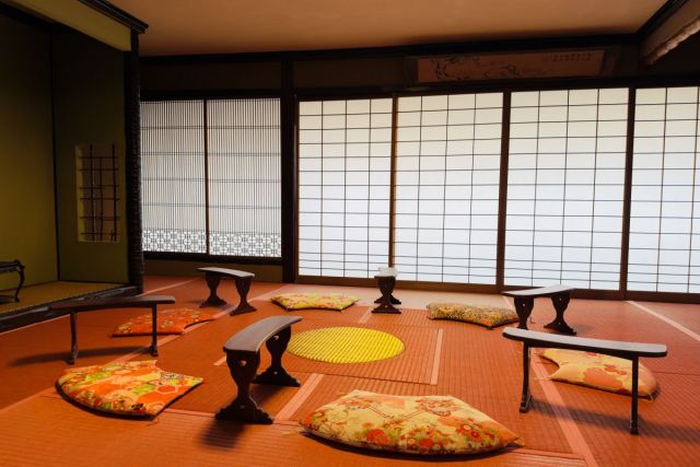 伝統に新しい息吹を加えて修復した相馬樓は、1階の20畳部屋を「茶房くつろぎ処」とし、2階の大広間は舞娘さんの踊りとお食事を楽しむ演舞場に、また、かつての厨房は酒田舞娘のけいこ場となっています。