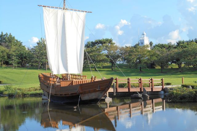 園内には、日本最古級の木造六角灯台や方角石、往時活躍した千石船(1/2で再現)などがあり、港町の風情を醸し出しています。