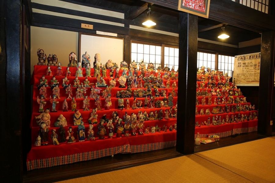 江戸時代末期から戦後にかけて作られた昔ながらの瓦人形が奥座敷に並ぶと素朴な懐かしさに包まれます。