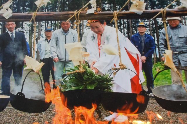 巫女舞では、鍋に湯を沸かし、その中に笹束を浸し清めとして身体に振り掛けるところから「湯立神楽」と言われています。