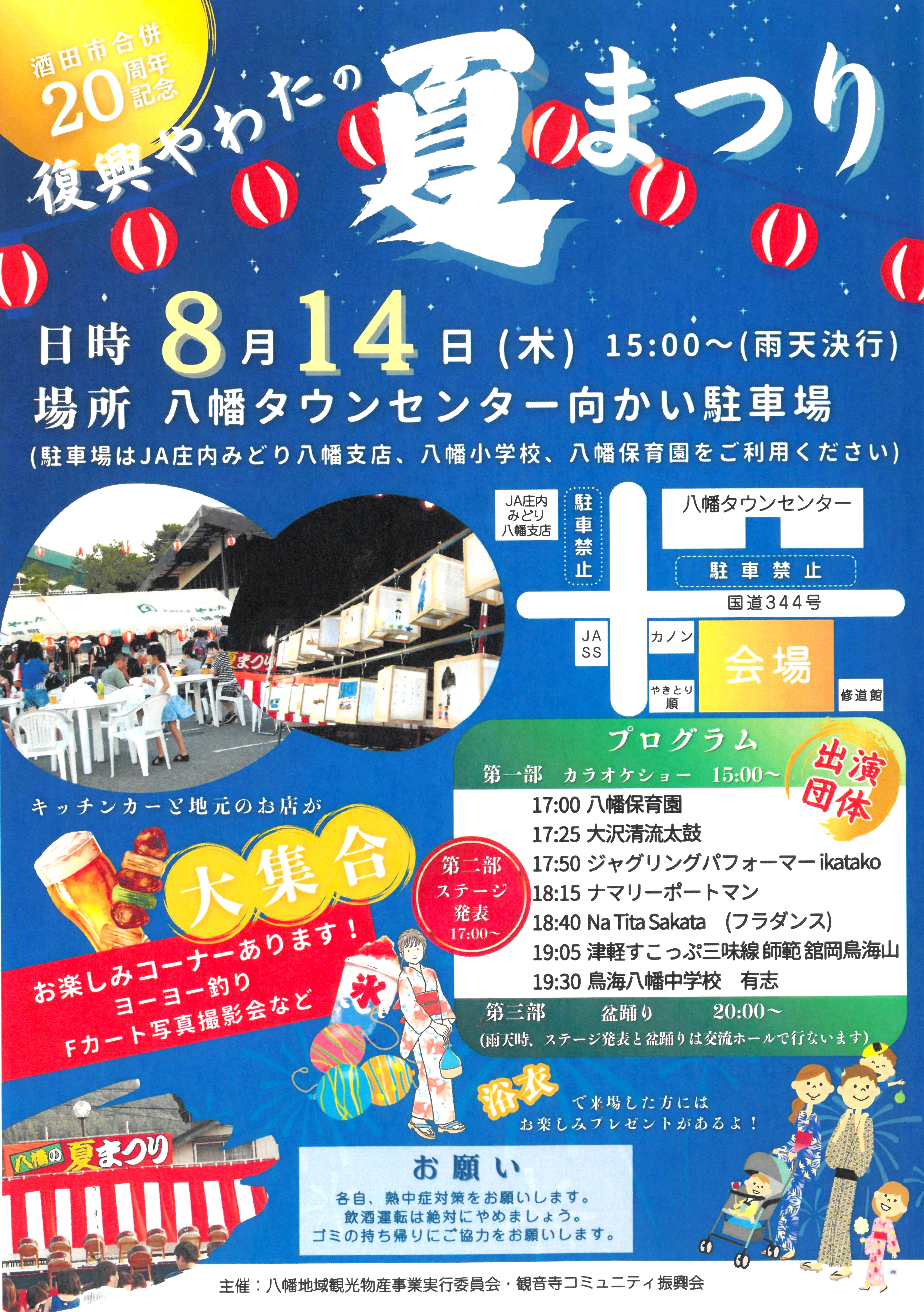 がっぺい20しゅうねんきねん ふっこうやわたのなつまつり地元の飲食店やキッチンカーによる飲食販売や、ステージ発表に盆踊りが行われます。