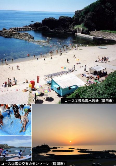 海水浴を楽しんだ後に、コテージ村や遊楽里で休憩・宿泊できるコースです。帰りに道の駅鳥海「ふらっと」で地場のお土産もどうぞ。