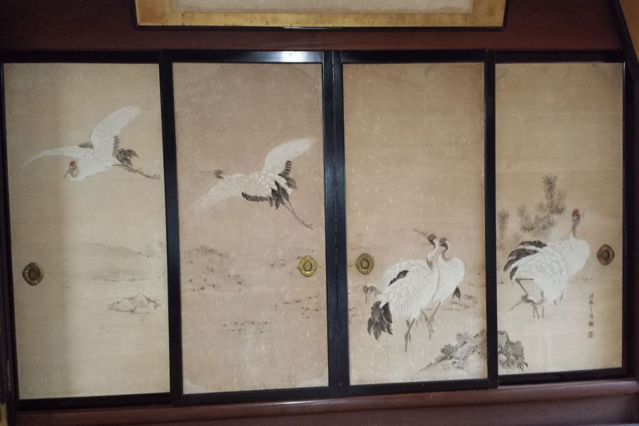 この鶴の襖絵は鶴峯の代表作で、恩師である勝樂寺住職恵教への報恩のため、恵教の33回忌にあたり文久元年に寄進されたものです。