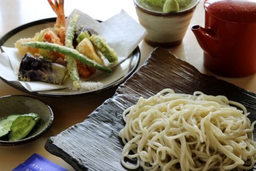 てうちそば でわ山形県産の玄そばを使用した挽きぐるみの田舎そばと甘さ控えめで飽きがこないもろこしが人気です
