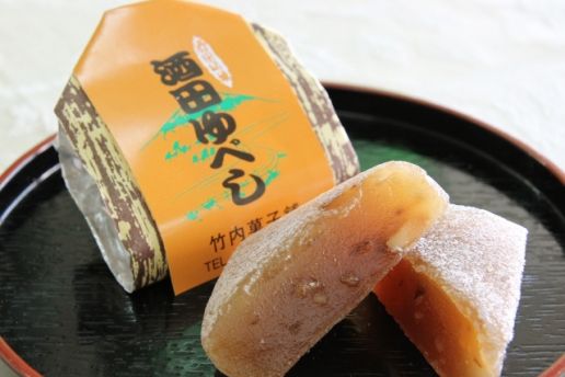 人気のお菓子は酒田ゆべし、鳥海山の伏流水と厳選素材の国産もち米と国産くるみを使い、地元の醤油と砂糖で甘辛に味付けしたもちもち食感のくるみゆべしです。