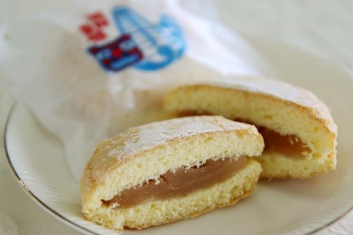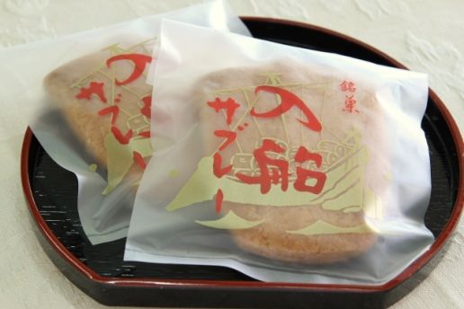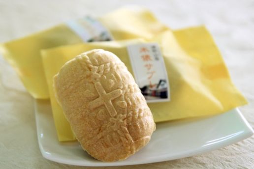 米俵の形をした最中にサブレー生地を入れて焼いたお菓子、米俵サブレーは酒田夢の倶楽でも購入できます。