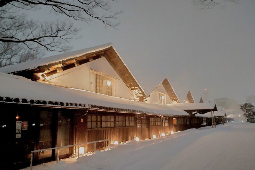 冬の季節の雪のある山居倉庫のライトアップも素敵です。