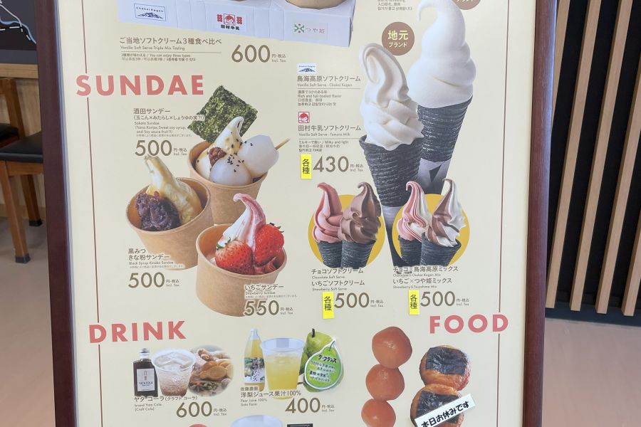 山居倉庫時代から人気の炒った米粉がほのかに香ばしいつや姫ソフトと、ミルキーで後味がすっきりとした味わいの田村牛乳ソフト、そしてしっかりとしたコクと旨味が濃厚な鳥海高原ソフトの庄内のソフトクリーム3種類を贅沢に味わえます。